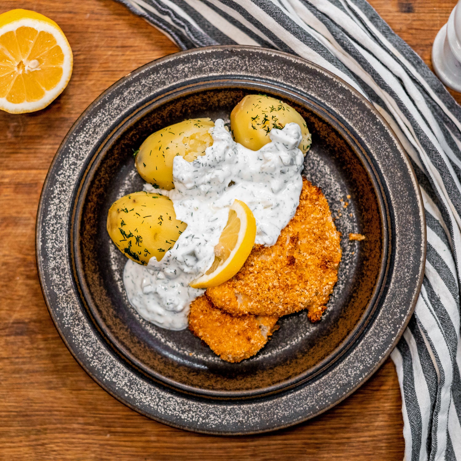 Smail AlihodzicIngredienser: Potatis - 3 st Torskfiléer - 180 g Crisy chicken kryddmix (Santa Maria) - 1/4 påse Panko - 1 dl Äggvita - 1/2 dl Dillsås: Grekisk yoghurt 0% -...